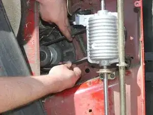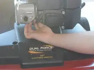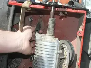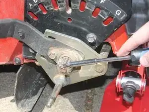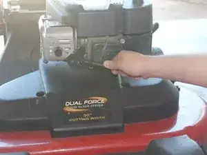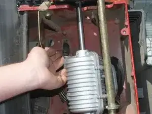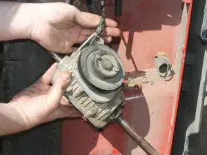 Снимите трансмиссию с нижней стороны газонокосилки.