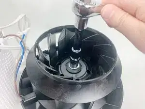 Используйте торцевой ключ 13 мм с удлинителем, чтобы открутить гайку, удерживающую вентилятор, и снимите все крепежные элементы со шпинделя.