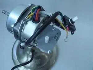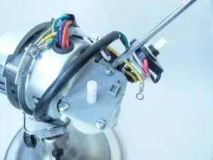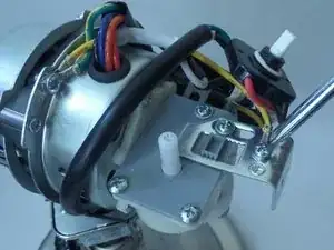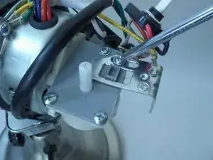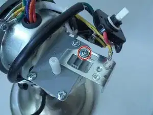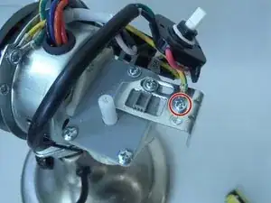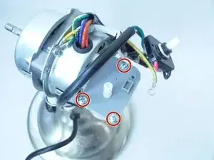 Отверткой крестовой №3 отверните и снимите болт длиной 7 мм и маленькую шайбу, крепящие жёлтый и зелёный провода к опоре корпуса мотора.