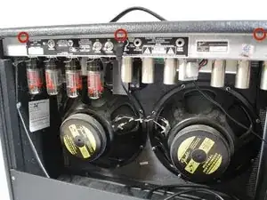 Открутите оставшиеся три винта на задней стороне головки усилителя, как показано красными кругами. Держите головку усилителя надёжно, пока вы это делаете, поскольку она больше не будет закреплена винтами.