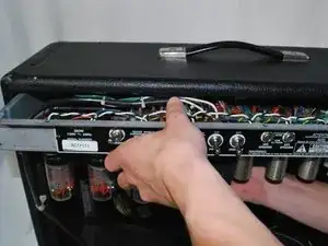Повторите шаги 6–1 в обратном порядке, чтобы собрать усилитель! Всегда используйте только одну руку при работе в головке усилителя и берегите лампы.