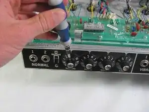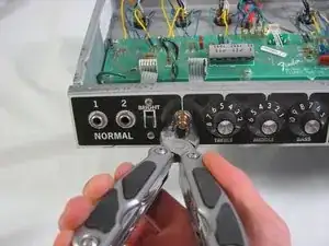 С помощью гаечного ключа или плоскогубцев также снимите гайки с входных разъёмов normal и vibrato