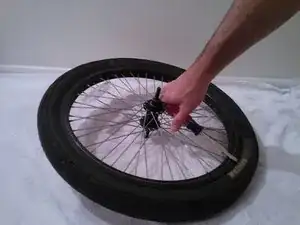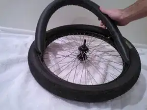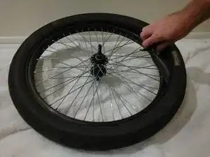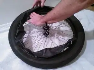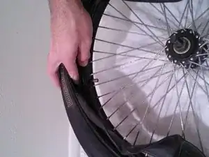 Теперь просто зафиксируйте шину обратно между кромками обода так, чтобы она вернулась в исходное положение. Затем установите колесо обратно в вилку и затяните его.