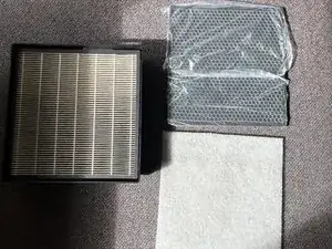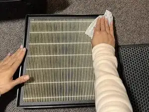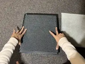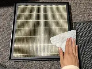 Возьмите новый HEPA-фильтр и убедитесь, что наклейки выровнены, а углы предварительного фильтра прижаты до плотного прилегания к угольному фильтру.