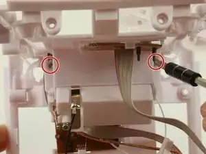 Найдите часть рамы с блоком батарей и выключателем, затем удалите два винта Phillips #2 длиной 6 мм, расположенные по обе стороны блока батарей.