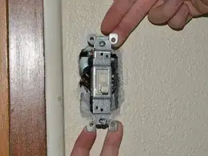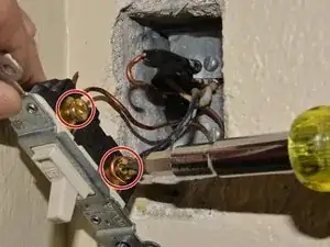 Ослабьте винты по обеим сторонам выключателя до тех пор, пока провода не смогут быть отстёгнуты. При необходимости эти винты можно полностью снять, чтобы провода не выпрямлялись.