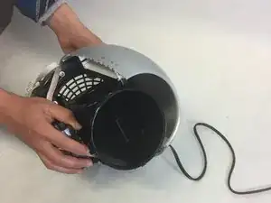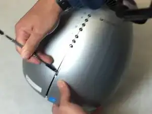 Вставьте плоский инструмент под небольшим углом влево от сетевого шнура. Нажмите на защёлку и раздвиньте две половины корпуса.