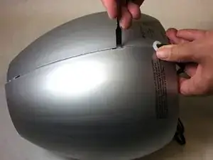 Найдите защёлку примерно в 1 дюйме ниже верхнего вентиля. Вставьте плоский инструмент боковым движением за защёлку и нажмите внутрь, к центру устройства. Удерживая защёлку нажатой, раздвиньте две половины корпуса, чтобы держать оболочку раскрытой.