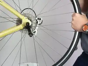 Держите велосипед так, чтобы колеса располагались в воздухе и велосипед мог держаться самостоятельно.