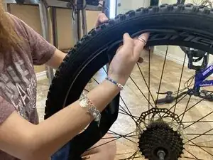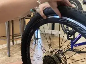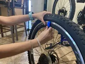 Руками подтолкните шину вверх и назад в обод, чтобы камера оказалась внутри. Продолжайте, пока это не станет труднее.