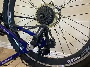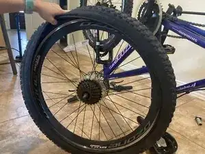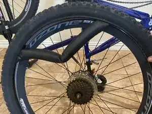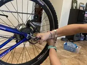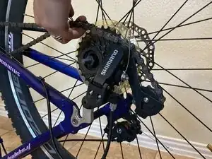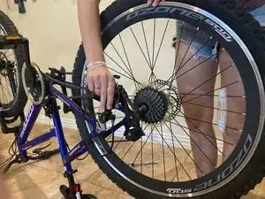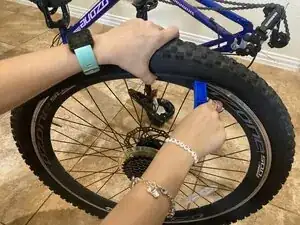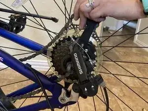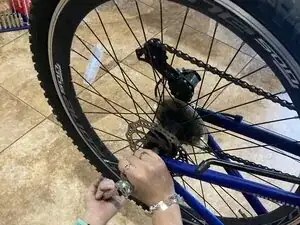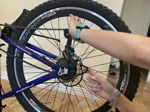 Правой рукой продолжайте оттягивать задний переключатель вперед и захватите колесо левой рукой.