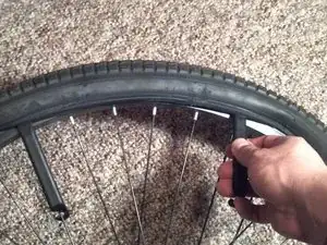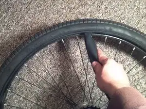 Вставьте один лебедку для шин под шину и зацепите ее за спицу. Вставьте другую лебедку рядом с первой и прокатите ее по ободу, чтобы снять одну сторону шины с обода.