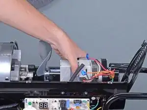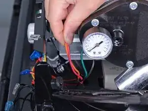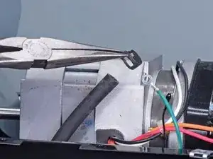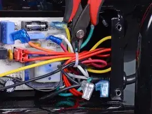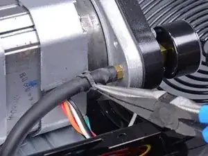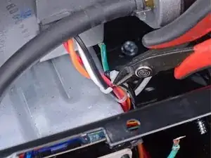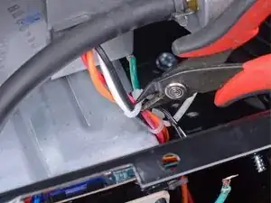 Используйте кусачки, чтобы перерезать стяжку оранжевого и красного проводов около двигателя.