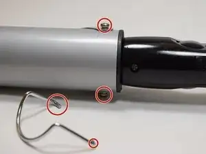 Держите обеими руками, аккуратно отсоедините оба конца металлической подставки от корпуса, оттянув от бочки.