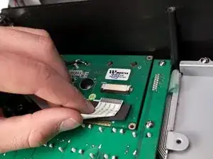 С помощью двух пластиковых инструментов для открытия, сдвиньте черный запирающий механизм на разъеме ZIF к себе. Это позволит отсоединить шлейф, соединяющий материнскую плату с экраном.