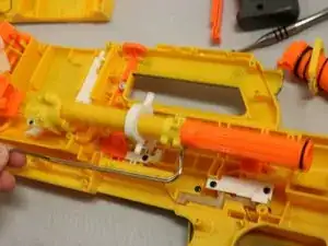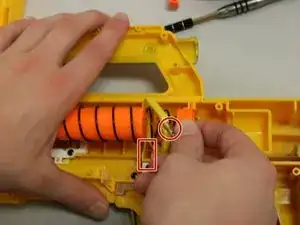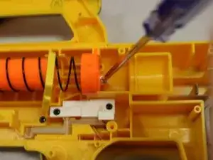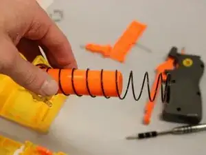 Верните на место оранжевую деталь с пружиной в её исходное положение на зубце дротика.