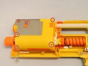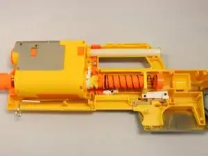 При установке зубца дротика обратно маленькая пружина на жёлтой детали должна быть размещена в своей выемке, как показано.