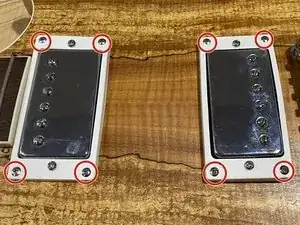 Отвинтите восемь винтов, фиксирующих звукосниматели, крестовой отвёрткой Phillips #0.