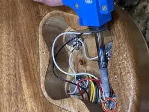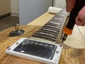 Снова переверните гитару. Протяните провод нового звукоснимателя через корпус в отсек управления и прикрутите звукосниматель, используя крестовую отвёртку Phillips #0.