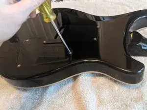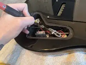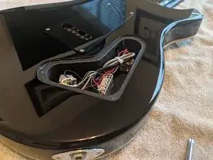 С помощью крестовой отвертки открутите заднюю панель, открывая проводку звукоснимателей.