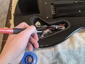 Осторожно начните паять новые провода звукоснимателей обратно.