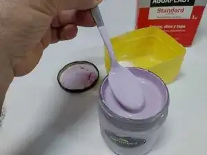 Когда шпатлёвочная смесь доведена до нужной консистенции, добавляйте по одной ложке краски и перемешивайте с раствором.