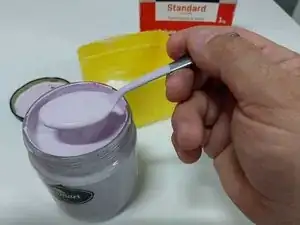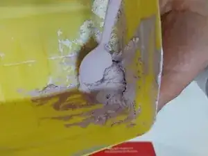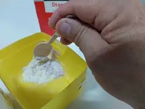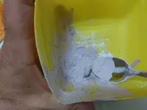 Добавьте ещё одну столовую ложку краски и продолжайте перемешивать. Если смесь станет слишком жидкой, краски добавлено слишком много — тогда «подсушите» её, понемногу подсыпая порошок и постоянно помешивая.