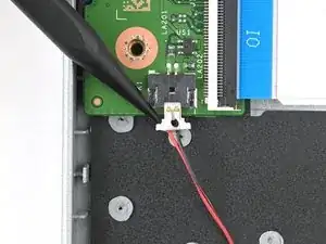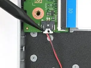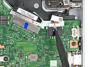 Используйте острый конец лопатки, чтобы нажать на выемку разъёма кабеля питания DC-IN, пока он не выйдет из гнезда.