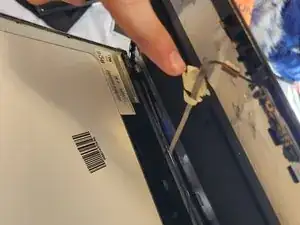 Отклейте ленту, фиксирующую кабели камеры к задней части экрана. Отодвиньте крышку назад для удобства доступа к экрану. Найдите 6 винтов по бокам рамы — по 3 с каждой стороны. Выкрутите их и отложите в сторону.