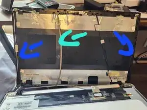 Упорядочьте кабели. Проследите за белым и чёрным проводами и разместите их на нужных местах (синие стрелки). Приклейте кабель камеры к задней части экрана (зелёная или голубая стрелка). Закрутите экран к раме шестью ранее снятыми мелкими винтами. Держите экран на месте.