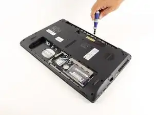 После выполнения всех предварительных шагов пора открутить ещё несколько винтов. Переверните ноутбук и сначала удалите все винты, отмеченные красным, крестообразной отвёрткой Philips #00. Эти винты имеют головку диаметром 1/4" и длину 3/8".
