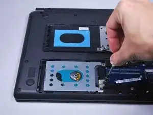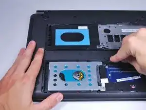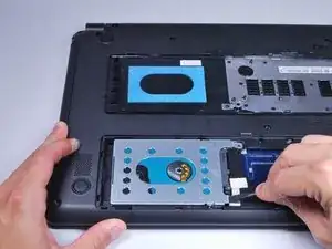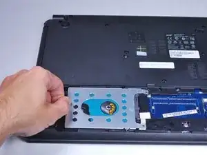 Возьмитесь за пластиковую язычок и оттяните жёсткий диск от разъёмов. Это освободит жёсткий диск.