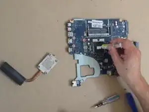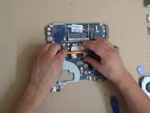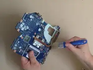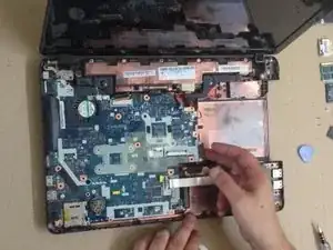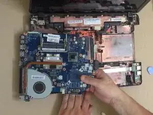 Чтобы вынуть материнскую плату, сначала приподнимите её с правой стороны (ближе к разъёму DVD‑привода).