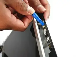 С помощью пластикового инструмента для открытия аккуратно приподнимите экран с задней стороны пластиковой крышки ноутбука.