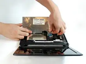 Положите нетбук днищем вверх на ровную поверхность.