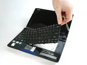 Используя металлическую лопатку, аккуратно подденьте каждую защёлку, освобождая клавиатуру. Следите, чтобы при переходе к следующей защёлке предыдущая не закрылась обратно.