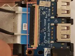 Подденьте чёрный фиксатор шлейфа порта/USB вверх пинцетом, чтобы освободить ленточный кабель.