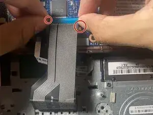 Снимите ленту, удерживающую меньшую шлейфовую ленту тачпада. Осторожно отключите меньшую шлейфовую ленту, потянув за неё.