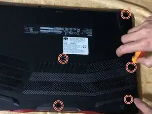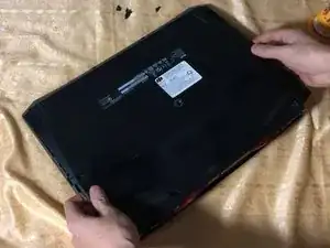 Переверните ноутбук так, чтобы нижняя панель была сверху.