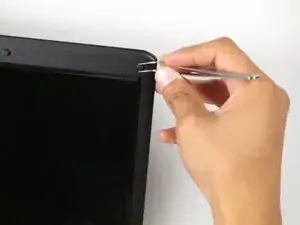 Вставьте ноготь или плоский конец лопатки в щель между основанием ноутбука и защитной накладкой петли с правой стороны. Аккуратно потяните накладку на себя, пока она не отщёлкнется.
