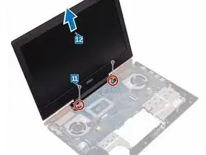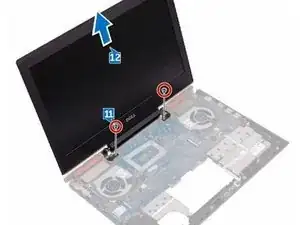 Установите два винта (M2.5x5), которые крепят узел дисплея к основанию корпуса компьютера.