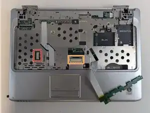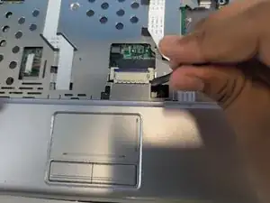 С помощью лопатки отогните синий фиксатор и отключите кабель тачпада.