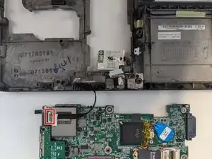 Переверните ноутбук и осторожно оттяните материнскую плату от задней панели.