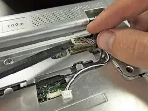 Пальцами или пинцетом отсоедините кабель динамика, сдвинув разъём в направлении к задней части 700m.