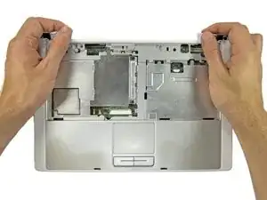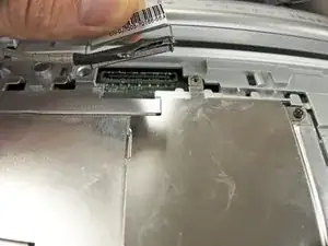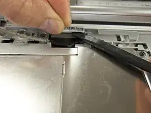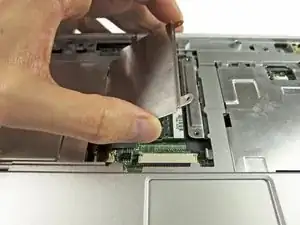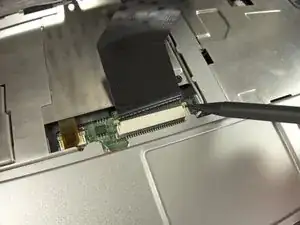Используйте заострённый конец лопатки, чтобы отключить разъём ленточного кабеля тачпада, поджав и разжав маленькие защёлки по обеим сторонам.