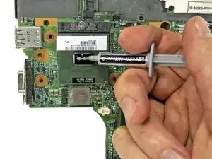 Снимите два винта с крестообразным шлицем с верхнего правого края материнской платы.