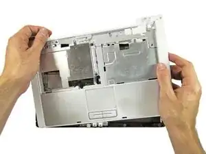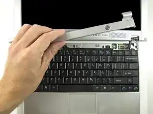Начиная с левой стороны, используйте плоский конец лопатки, чтобы аккуратно поддеть пластиковую накладку вдоль верхней части клавиатуры. Снимите накладку.