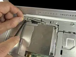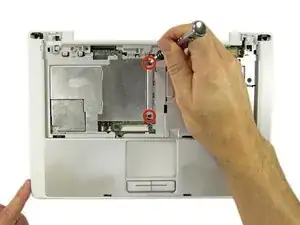 Удалите маленький винт с крестообразной головкой с кромки отсека оптического привода.