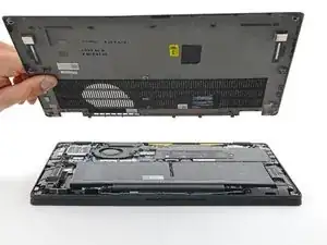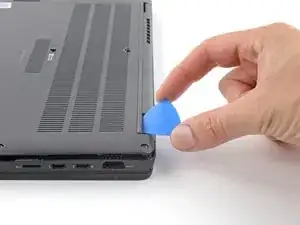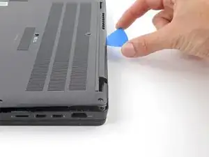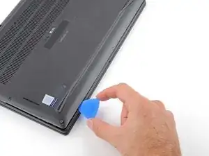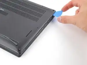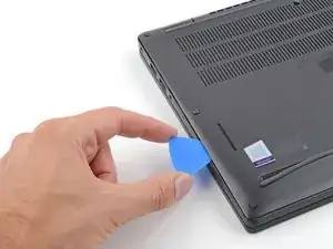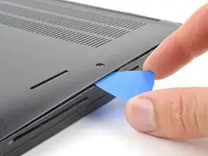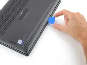 Вставьте лопатку между задней крышкой и правым шарниром экрана, чтобы отпустить первую защёлку вдоль заднего края.