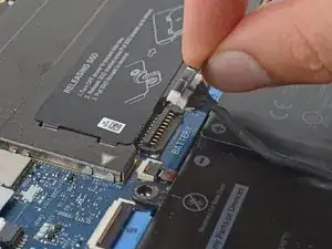 Возьмитесь за чёрную вытягивающую бирку на головке разъёма батареи и тяните прямо вверх, чтобы отключить его.
